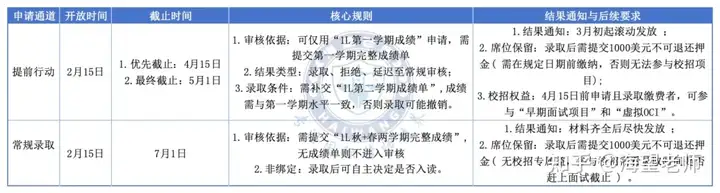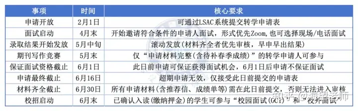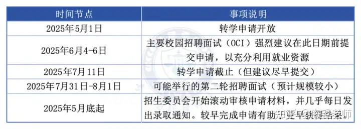 - OCI 参与提示:OCI对所有已确认入学(已缴纳押金)的转学生开放,其参与截止日期为 6 月初。因此,建议申请人在 6 月初前提交所有申请材料;若获得录取,也建议在 6 月初前缴纳入学押金,以确保顺利参与 OCI。