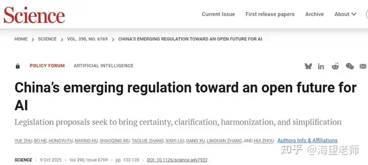 这篇标题为《China’s emerging regulation towards an open future for AI》(中国人工智能监管正在兴起,迈向人工智能开放未来)的论文聚焦于中国开源人工智能发展和监管制度,它的发表体现了国际科学界对我国参与共建人工智能全球治理体系的关注和认可。