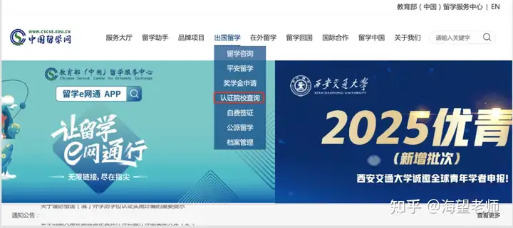 第二步:进入查询入口:在官网首页找到“出国留学”菜单下的 “认证院校查询” 板块,点击进入指定查询链接。