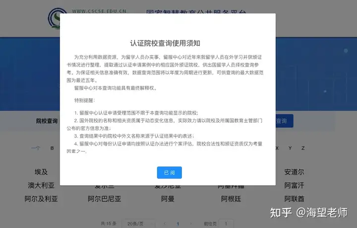 第三步:页面弹出 “认证院校查询使用须知”,需仔细阅读后点击 “已阅”(须知核心:数据范围为 2020 年 6 月 28 日 - 2025 年 6 月 28 日,认证申请不限于显示院校,院校资质以官方公布为准);