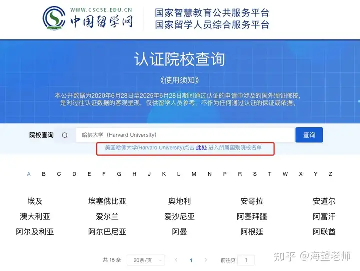 第四步:查询院校,可通过 “按国家筛选”(如选择 “美国”“日本” 等)或 “直接输入院校名称搜索” 两种方式,查询目标院校是否在认证名单内。