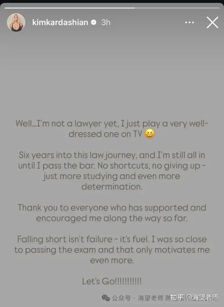 今年10 月,卡戴珊曾透露自己正在等待考试结果,当时她表示希望 “两周内” 能获得执业资格。