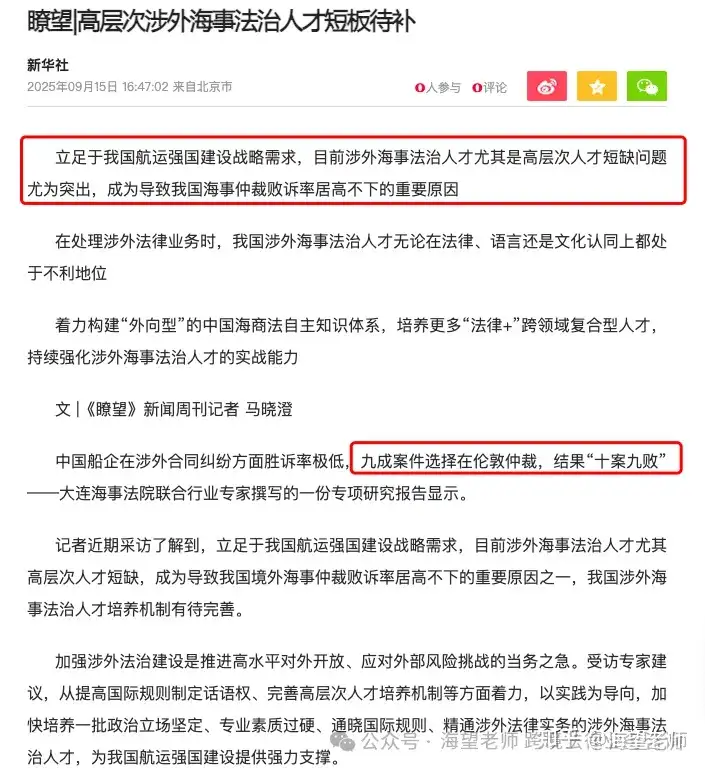 据大连海事法院联合行业专家撰写的一份专项研究报告显示,中国船企在涉外合同纠纷方面胜诉率极低,九成案件选择在伦敦仲裁,结果“十案九败”。给相关企业造成了巨大的经济损失。其背后折射出的,不仅是国际规则话语权的弱势,更是我国能够主导重大涉外海事案件、通晓国际规则的高端法律人才的匮乏。