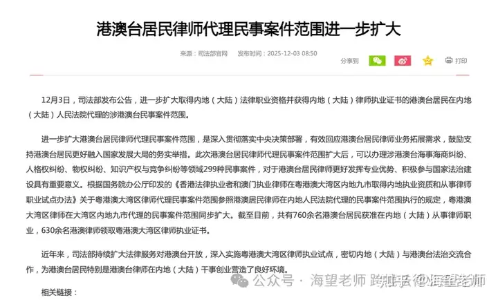 踩准刚需!国家司法局公告港澳台居民律师代理民事案件范围进一步扩大-行业资讯-海望老师