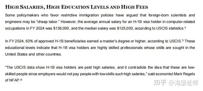 根据美国国家政策基金会(NFAP) 于2025年11月发布的《H-1B Petitions and Denial Rates For FY 2025》报告,2024 财年计算机相关领域 H-1B 持有者平均年薪 13.6 万美元、中位数 12.5 万美元,63% 获批者拥有硕士及以上学历,反驳了“廉价劳动力” 说法。