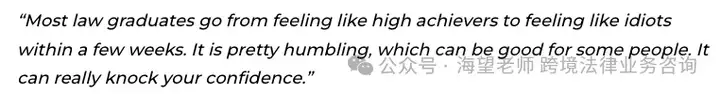 "大多数法学生入职几周内,就会从昔日的优等生,变得觉得自己一无是处。这种落差让人学会谦卑,对有些人来说并非坏事,但也会严重打击自信心。"