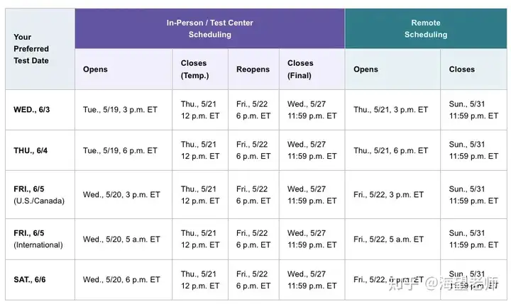 线下考点预约优先开放,具体时间为5月19日(周二)和5月20日(周三),不同考试日期对应不同的开放时刻(均为美东时间):